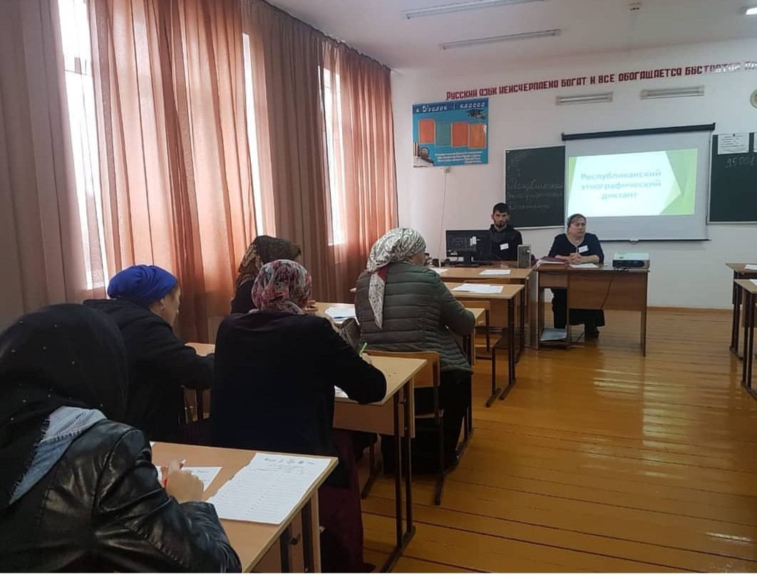 2 ноября 2018г в МБОУ 《Первомайская СОШ》, собрались желающие принять участие во Всероссийской просветительной акции «Большой этнографический диктант». Для проведения мероприятия было оформлено фойе и аудитория. В течение 45 минут участники диктанта отвечали на 30 тестовых заданий общефедерального компонента.
