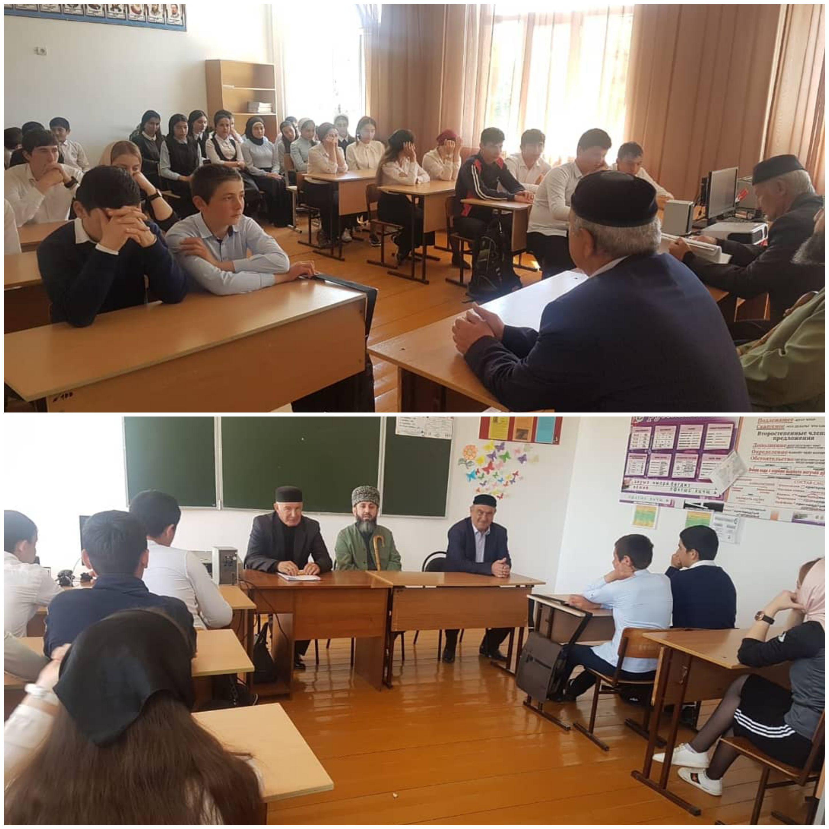 16.05.2019В рамках реализации Единой Конвенции по Духовно-нравственному воспитанию молодежи Кадий Веденского района Джафаров Арби совместно с заместителем председателя совета ВОВ района Яраги Сайдулаевым, провел профилактическую беседу с учащимися МБОУ "Первомайская СОШ" с 7-11 кл на тему: " Ахмат-Хаджи- достойный сын чеченского народа!"